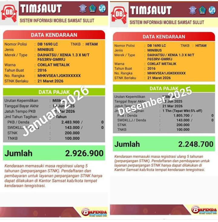 Manado, Lintassejahteranews.com Kenaikan pajak yang dialami sejumlah warga Sulawesi Utara pada tahun 2026 menjadi perhatian publik setelah ramai diperbincangkan di media sosial Berdasarkan unggahan warga nominal pajak yang pada tahun 2025 tercatat sebesar Rp2.248.700 meningkat menjadi Rp2.926.900 pada 2026 atau naik sekitar Rp678.200 dalam satu tahun setara hampir 30% Senin(05/01/2026).
