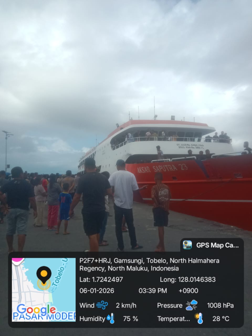 Tobelo (Maluku Utara), Lintassejahterannews.com Kapal Penumpang KM Aksar Saptra 23 yang melayani rute Manado-Tobelo dilaporkan tiba dengan selamat di Pelabuhan Tobelo. Halmahera Utara, pada selasa, 6 Januari 2026 sekitar pukul 03:41 WIT.