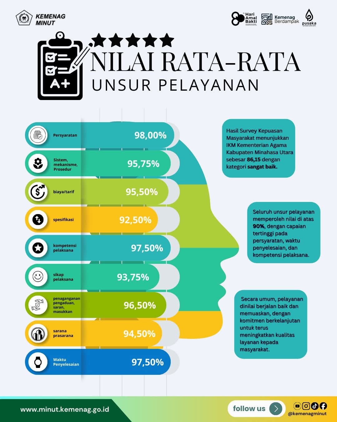 “Nilai IKM ini bukan sekadar angka, tetapi cerminan penilaian masyarakat atas kualitas layanan yang kami berikan. Ini menjadi penguatan komitmen kami untuk menjaga standar pelayanan publik yang cepat, transparan, dan akuntabel,” tegas Kemenag Minahasa Utara.