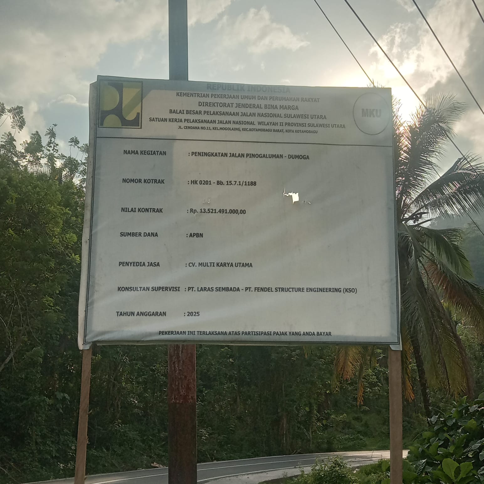 Situasi ini bertolak belakang dengan narasi keberhasilan yang biasa disampaikan oleh lembaga terkait. BPJN Sulut beberapa waktu lalu menyatakan telah “menuntaskan” paket peningkatan jalan Pinogaluman-Dumoga sebagai akses menuju Bendungan Lolak. Ruas ini, dengan panjang 11,5 km, bahkan menjadi bagian dari program Instruksi Presiden (Inpres) untuk percepatan konektivitas dengan alokasi usulan yang mencapai Rp34,1 miliar. Kontras antara pernyataan “tuntas” dengan realita di lapangan yang diduga hanya 30% selesai memperkuat dugaan adanya masalah serius dalam pengelolaan proyek.