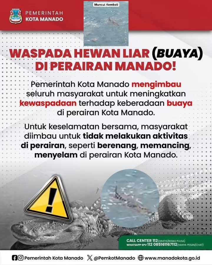 Manado, Lintassejahteranews.com – Pemerintah Kota Manado mengimbau masyarakat untuk meningkatkan kewaspadaan terhadap keberadaan buaya di perairan Teluk Manado. Imbauan ini dikeluarkan setelah beberapa laporan tentang penampakan buaya di area pesisir dan perairan Teluk Manado, sehingga membuat warga setempat merasa was-was dan khawatir akan keselamatan mereka.