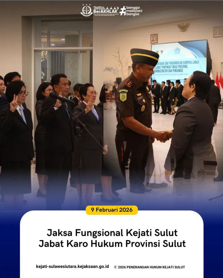 Manado (SULUT), Lintassejahteranews.com – Jaksa Fungsional Kejaksaan Tinggi Sulawesi Utara (Kejati Sulut), Dr. Budi Paskah Yanti Putri, S.H., M.H., resmi dilantik sebagai Kepala Biro Hukum Provinsi Sulawesi Utara. Pelantikan dilakukan langsung oleh Gubernur Sulawesi Utara Mayjen TNI (Purn) Yulius Selvanus Komaling, bertempat di Wisma Gubernuran, Manado. Senin 9/2/2026